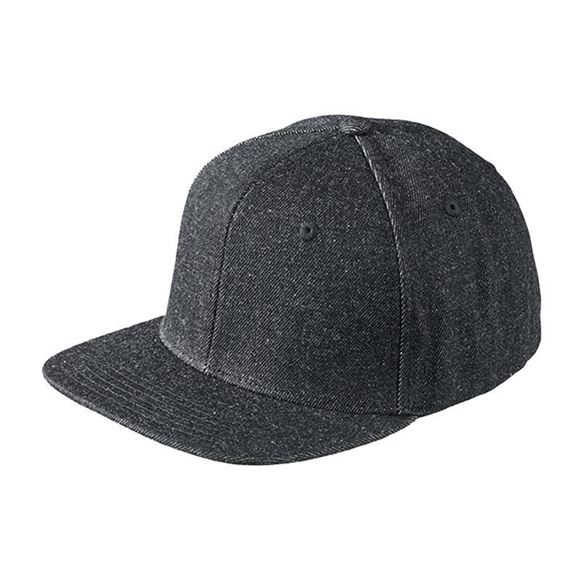 Outer fabric: 100% cotton.Flat peak with 6 decorative stitching lines.Cap in hip jeans fabric.Flag-label on adjuster.Laminated front panels.6 embroidered ventilation holes.Pleasant to wear due to padded sweatband.Size adjustment by fastener 'click & snap'.